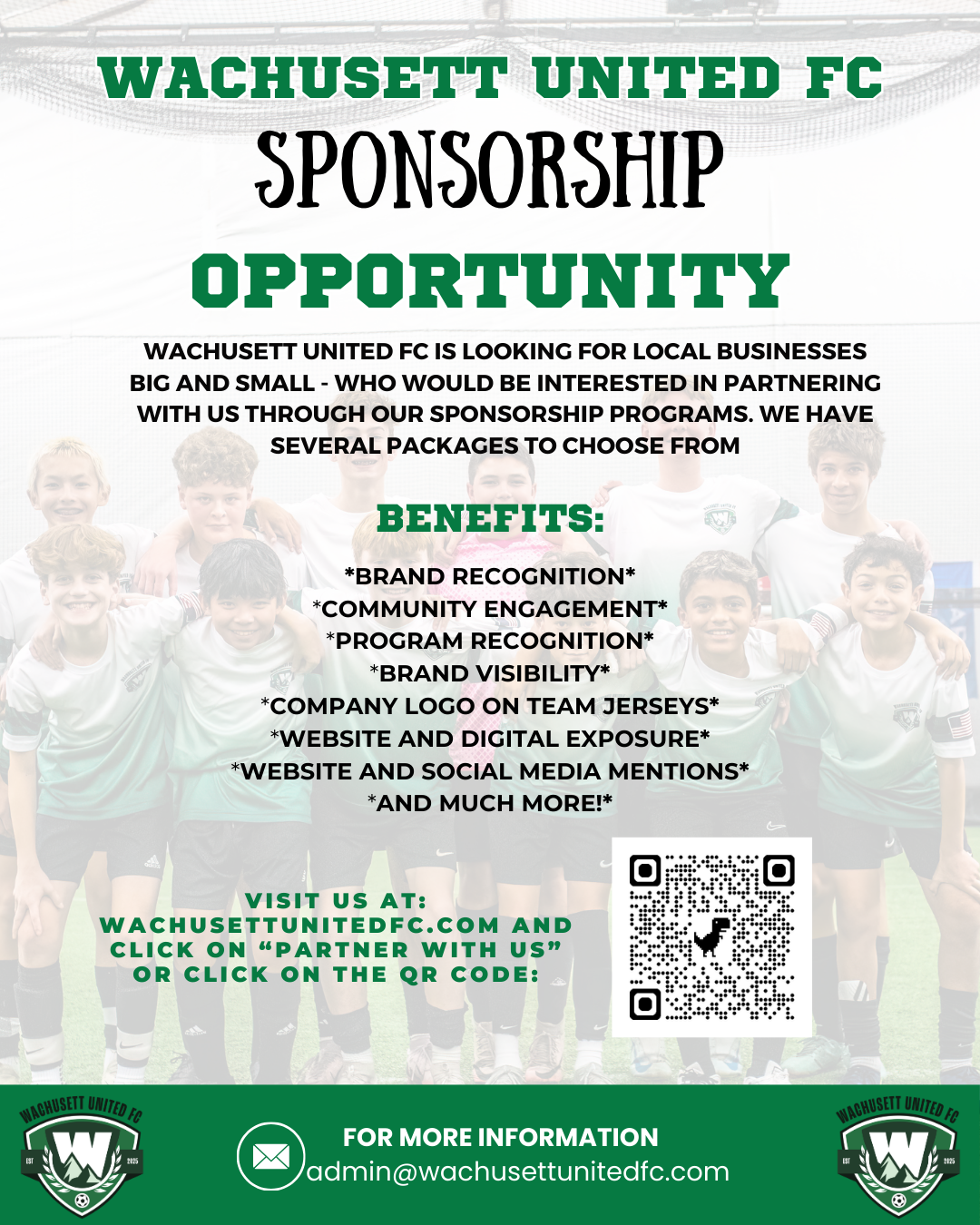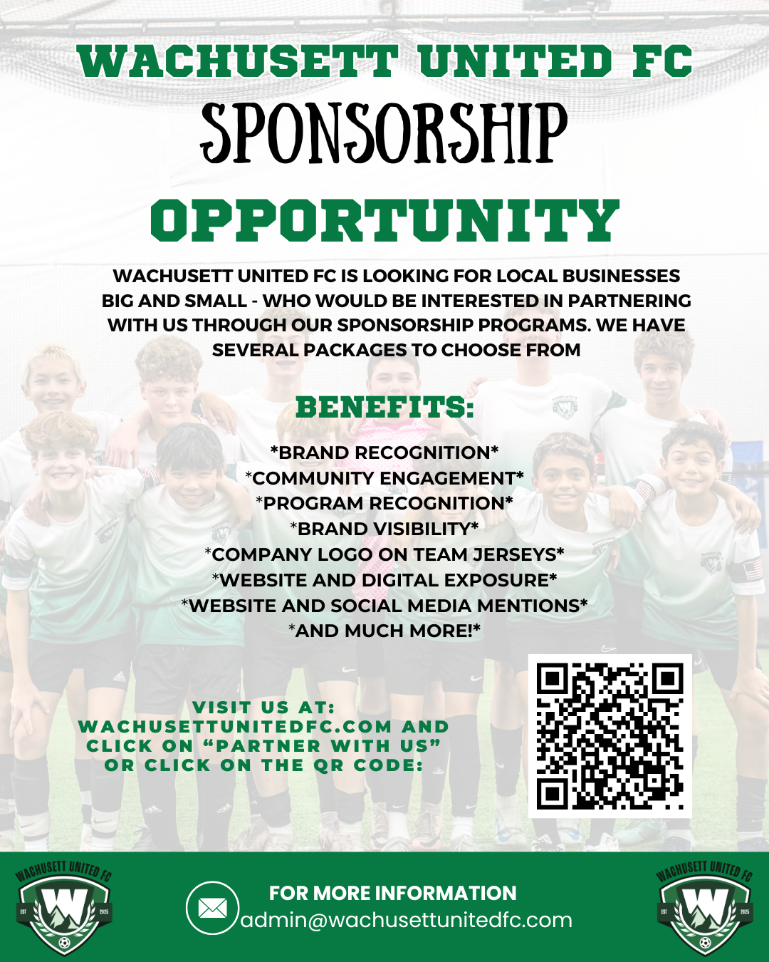 Are you a business owner? Interested in becoming a sponsor? Wachusett United FC would love to hear from you! We are looking for Sponsorships in a wide variety of ways. We have several packages to chose from. Please fill out the form below to learn more about our partnering/sponsorship opportunities!